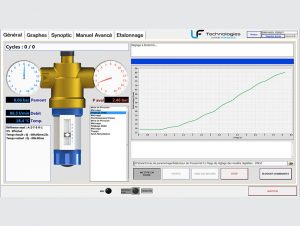 The program installed on the control PC was developed under LabVIEW. It allows to control the test pressure (via a pump) and the flow rate (via a proportional valve), but also to measure, display curves and record :