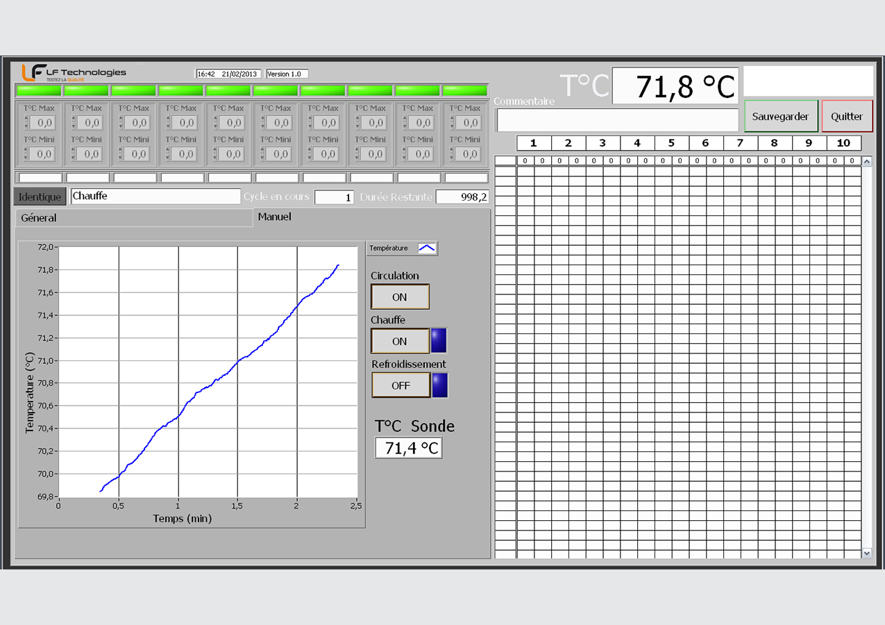The teams at LF Technologies have designed a cyclic temperature test loop capable of controlling the heating or cooling ramps of 10 mechanical thermostats simultaneously. The bench carries out tests in accordance with standard NF EN 257 (Mechanical thermostats for gas appliances). This bench enables the operator to carry out a series of programmable cycles via a PC, on which the thermostat switching values are automatically archived in the form of a usable Excel spreadsheet.