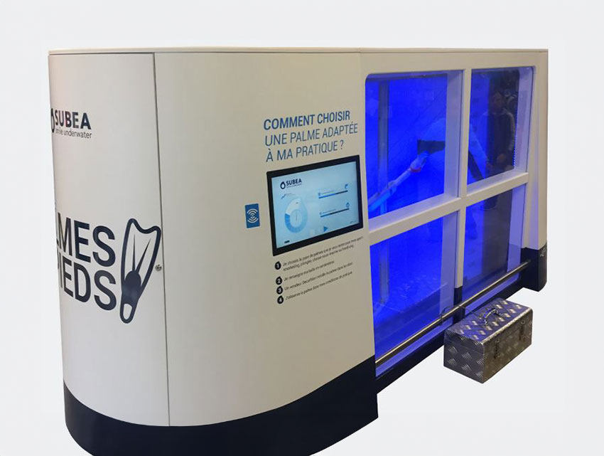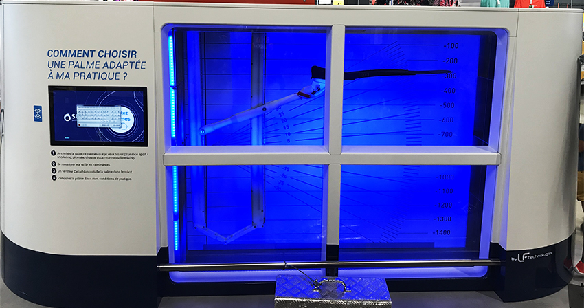 The Robot-Palm is a test bench designed to measure the thrust, power and efficiency of a fin under submerged conditions. It simulates finning movements to objectively compare performance and support product design.